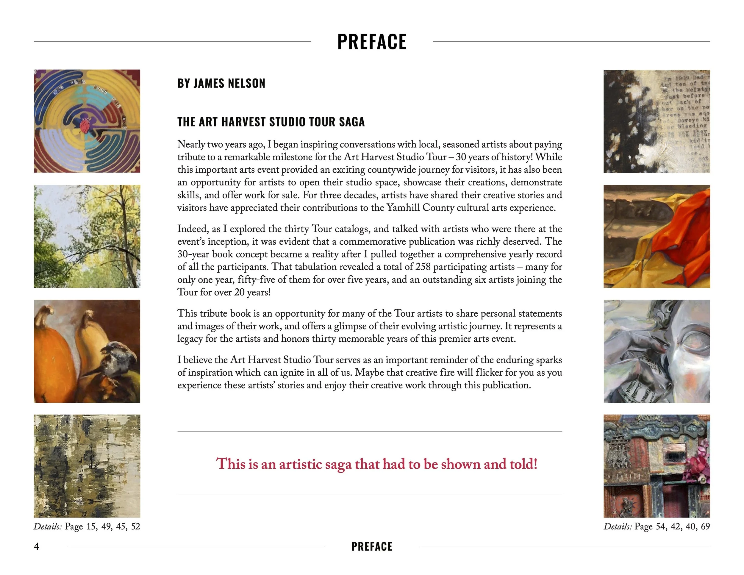 We are pleased to announce our publication of a commemorative book featuring most of the over 250 Art Harvest Studio Tour artists who have participated since it started in 1993. The book presents artist statements and their artwork throughout the past 30 years. Included is a section featuring twenty Yamhill County poets who have created original writings based on a selection of artwork by twenty AHST artists. The book also includes personal stories by eight tour artists, presenting their perspective and insight into specific art works.
